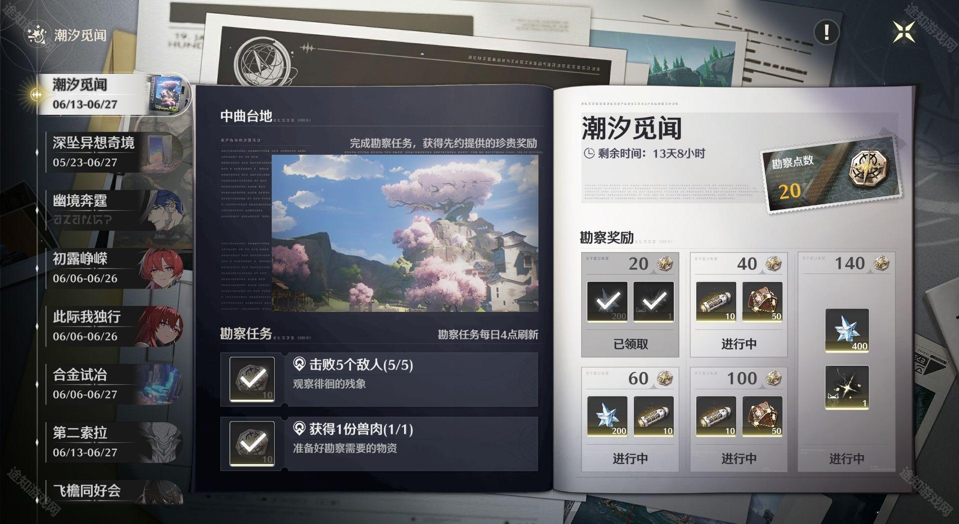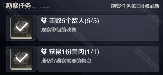 鸣潮潮汐觅闻活动第一天怎么做 鸣潮潮汐觅闻活动第一天攻略 时间:2022/12/19 17:15:00小编:来源: 鸣潮潮汐觅闻活动第一天怎么做?完成每日勘察任务,获得勘察点数,勘察点数到达指定数额就可以获得奖励。那么第一天的任务我们该怎么完成呢?接下来就和小编一起看看《鸣潮》潮汐觅闻活动第一天攻略吧。 》》》小编推荐阅读:《鸣潮》潮汐觅闻限时勘察活动攻略大全 《鸣潮》潮汐觅闻限时勘察活动攻略大全 第一天 第二天 第三天 第四天 第五天 第六天 第七天 / 《鸣潮》潮汐觅闻活动第一天攻略 答:第一天我们需要击败5个敌人并获得1份兽肉 活动任务流程 1、在野外随便击败5个敌人 2、攻击动物获得兽肉 3、打开活动界面,点击左下角2个金方框领取今日勘察点数 4、领取今日勋章奖励 相关文章 攻略心得 波西亚时光隐藏宝箱位置全介绍 波西亚时光隐藏剧情有哪些? 炉石传说酒馆战棋新随从野猪老水手怎么样 炉石传说酒馆战棋野猪人随从 无限暖暖满电行动效果及获取方法 暖暖无限少女 原神5.0食谱有哪些 原神5.0新增食谱获取方法 王者荣耀九周年返场皮肤有哪些 王者荣耀九周年返场皮肤介绍2024 阴阳师大江山宴会邀约怎么玩 阴阳师大江山抉择怎么选 明日方舟第三季更新预告:第三季何时上线有哪些新内容 热门推荐 最热排行 评分最高 超进化物语 下载 阴阳师 下载 吉吉影音 下载 元气骑士 下载 率土之滨 下载 梦幻西游手游 下载 荒野行动 下载 元游中国象棋 下载 蛋仔派对 策略 1.95 GB 蛋仔派对手游 v1.0.220 - 安卓版 下载 神庙逃亡2 冒险 78.68MB 神庙逃亡2 v5.0.0 - 安卓版 下载 恋与制作人 角色 688.37MB 恋与制作人 v1.9.0823 - 安卓版 下载 天天斗地主 休闲 26.10MB 天天斗地主 v8.00.041 - 安卓版 下载 我的安吉拉 模拟 80.53MB 我的安吉拉 v4.2.1.306 - 安卓版 下载 无尽的拉格朗日:砺舰归来 下载 unVEIL the world 下载 燕云十六声 下载 元气骑士前传 下载 元气骑士 下载 战魂铭人 下载 阴阳师 下载 率土之滨 下载 梦幻西游手游 策略 182.11MB 梦幻西游手游 v1.532.1 - 安卓版 下载 蛋仔派对 策略 1.95 GB 蛋仔派对手游 v1.0.220 - 安卓版 下载 游戏王:决斗链接 策略 303.87MB 游戏王:决斗链接 v1.0 - 安卓版 下载 三国演义:吞噬无界 策略 479.74 MB 三国演义:吞噬无界 v4.1.14 - 安卓版 下载 超进化物语 策略 282.66 MB 超进化物语 v1.1.18 - 安卓版 下载 用户评论 deving