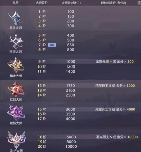 在下方的段位图中我们可以看到,精金大师就是第九阶大师等阶了,需要1000点大师分。