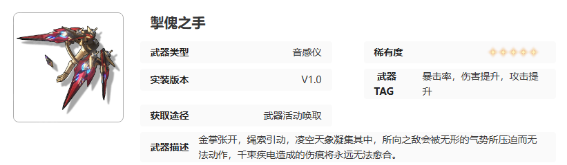 鸣潮武器掣傀之手培养材料是什么?吟霖的武器类型为音感仪。金掌张开,绳索引动,凌空天象凝集其中,所向之敌会被无形的气势所压迫而无法动作,千束疾电造成的伤痕将永远无法愈合。那么接下来就跟着小编一起来了解一下《鸣潮》吟霖专武掣傀之手培养材料一览。