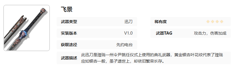 鸣潮武器飞景培养材料是什么?飞景是4星武器,类型为迅刀。此迅刀是珑一州令尹就任仪式上使用的典礼武器,黄金银杏叶花纹代表了珑应如银杏一般,虽孑遗世上,却依旧繁荣长存。那么接下来就跟着小编一起来了解一下《鸣潮》武器飞景培养材料一览。