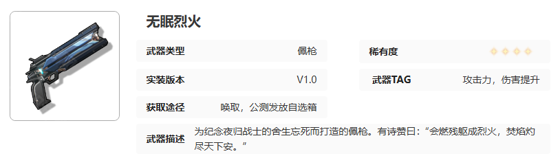 鸣潮武器无眠烈火培养材料是什么?无眠烈火是4星武器,类型为配枪。为纪念夜归战士的舍生忘死而打造的佩枪。有诗赞曰:“会燃残躯成烈火,焚焰灼尽天下安。”那么接下来就跟着小编一起来了解一下《鸣潮》武器无眠烈火培养材料一览。