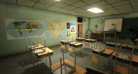 而当我们从空中摔到地面摔的七荤八素的时候,发现怪物已经消失,由于被摔的头晕脑胀,画面变得也有些模糊,我们再回到那个教室,房门却打不开了!