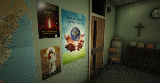 黑板前的讲桌右上角还有一本圣经,左下角有一块电池,(电池4拿取)由此可以知道,这应该是一所宗教学校!