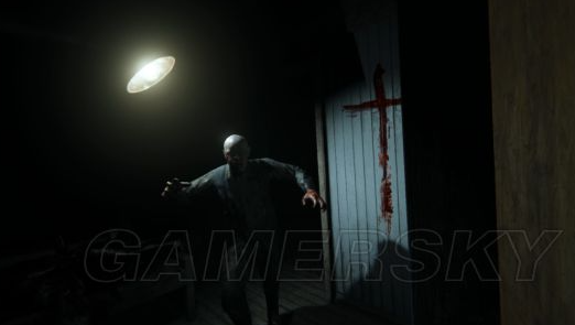 打开门,迎面见到的是一堆被肢解的尸体,旁边还站着恐怖的光头大叔,房间内画着一个血十字架,这大叔估计没想到有人会来,愣了一下,然后在摇曳的灯光中,充满杀气的冲向了我们,在一番搏斗中,主角毕竟是个记者,搏斗不过,被大叔房间内的楼梯上扔了下来。
