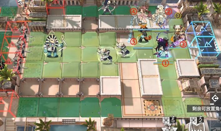 如图所示,开场依次部署煌(朝上)、夜莺(朝下)、塞雷娅、艾雅法拉(朝下)、伊桑(朝上)