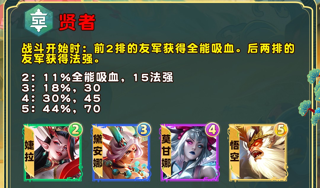 战斗开始时:前2排的友军获得全能吸血。后两排的友军获得法强。