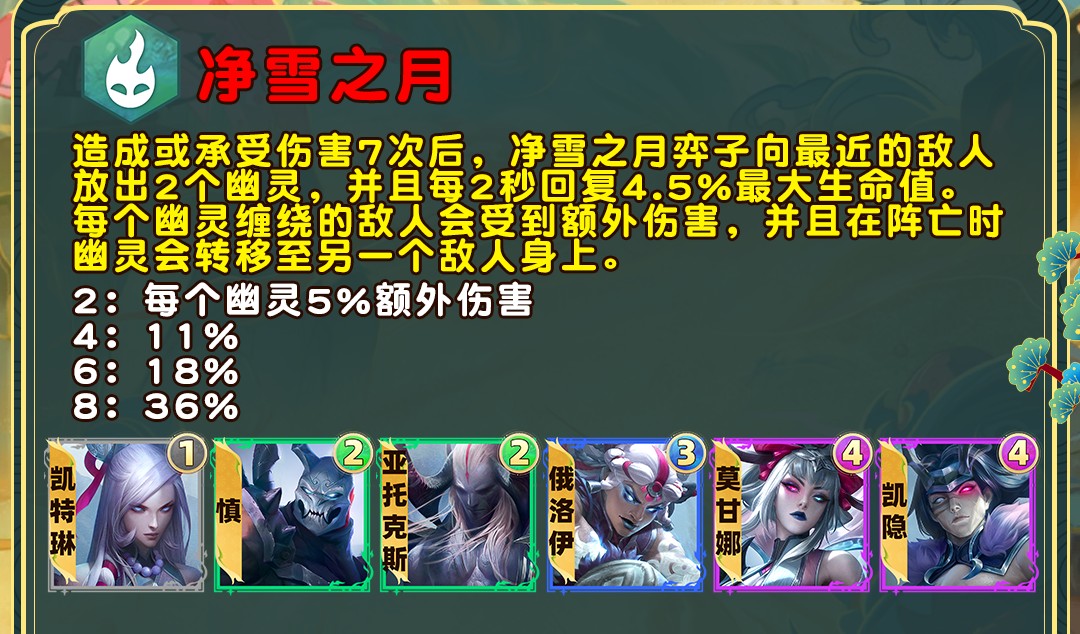 2:每个幽灵5%额外伤害净雪之月弈子在收到一定攻击或攻击一定次数时,自身回复生命值并释放2个幽灵。