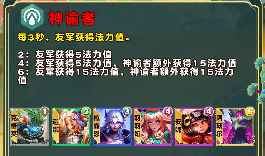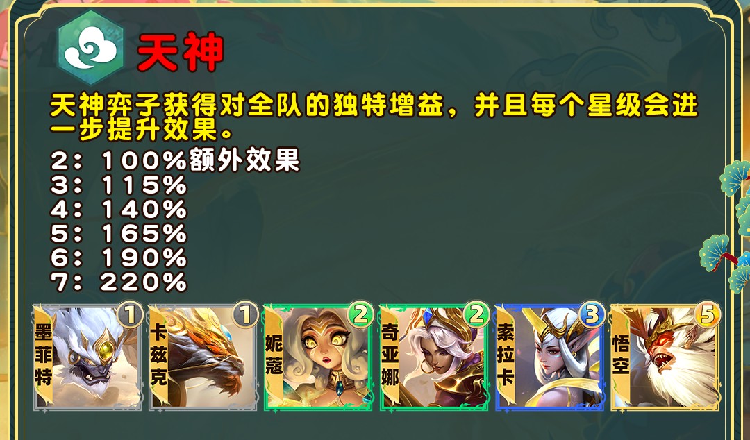 类似以往赛季的冒险家羁绊,每名登场的天神弈子都会为全队增加不同的属性。