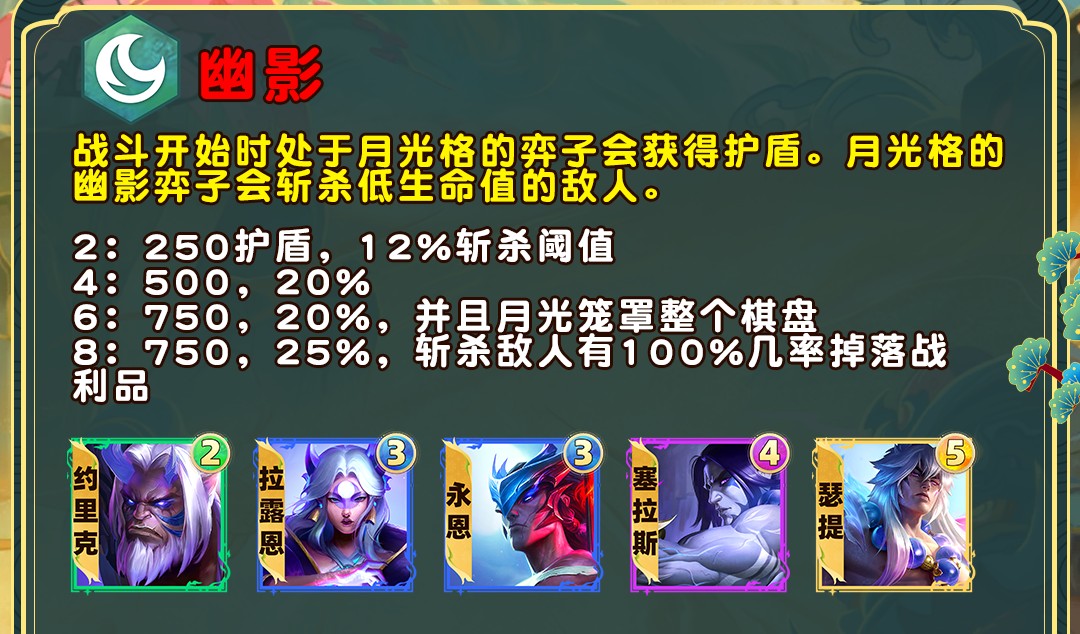 战斗开始时处于月光格的弈子会获得护盾。月光格的幽影弈子会斩杀低生命值的敌人。