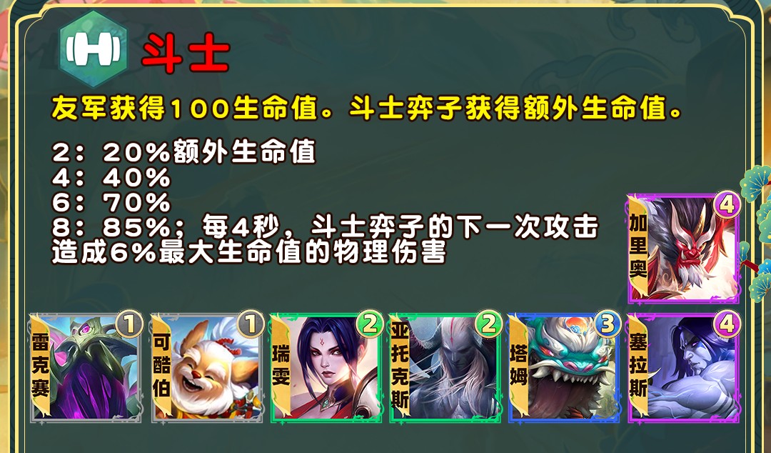 8:85%;每4秒,斗士弈子的下一次攻击造成6%最大生命值的物理伤害