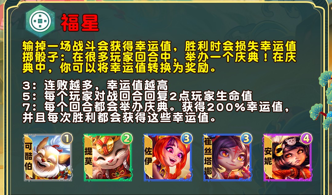 1、5福星羁绊新增每回合可以回复生命值,人造代谢无疑是增大了吃高层奖励的成功率。7福星需要2个转职。