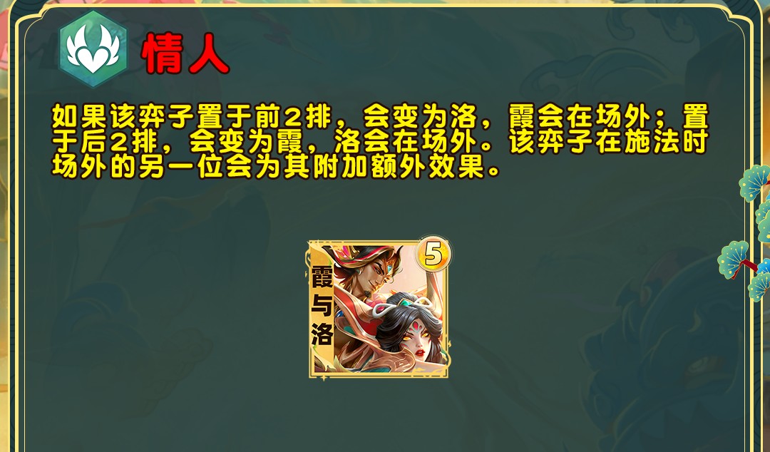 如果该弈子置于前2排,会变为洛,霞会在场外;置于后2排,会变为霞,洛会在场外。该弈子在施法时,场外的另一位会为其附加额外效果。