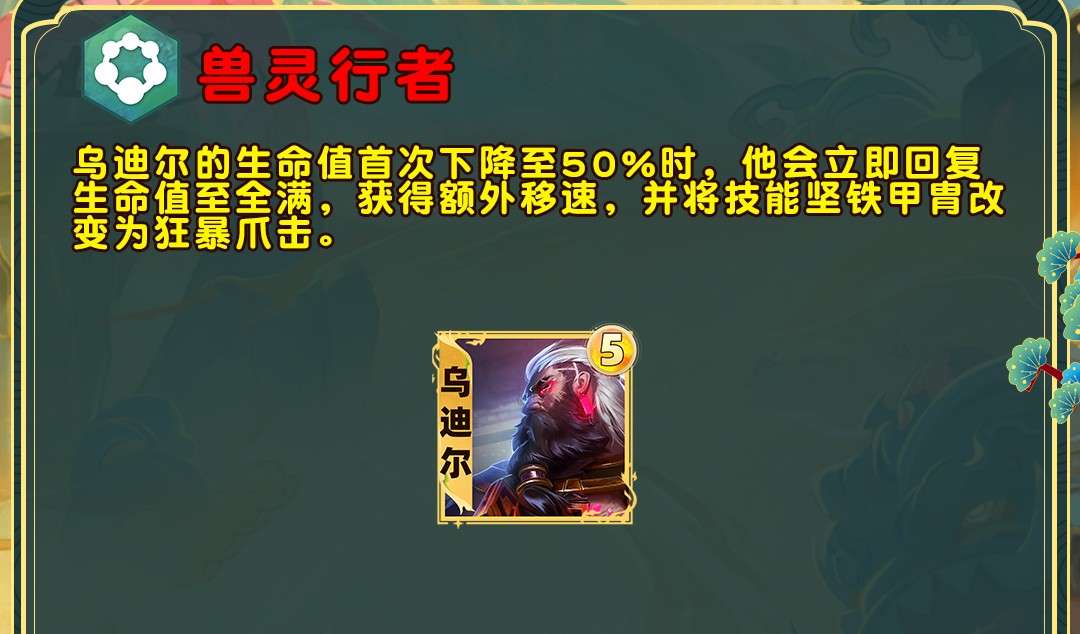 乌迪尔的生命值首次下降至50%时,他会立即回复生命值至全满,获得额外移速,并将技能坚铁甲胄改变为狂暴爪击。
