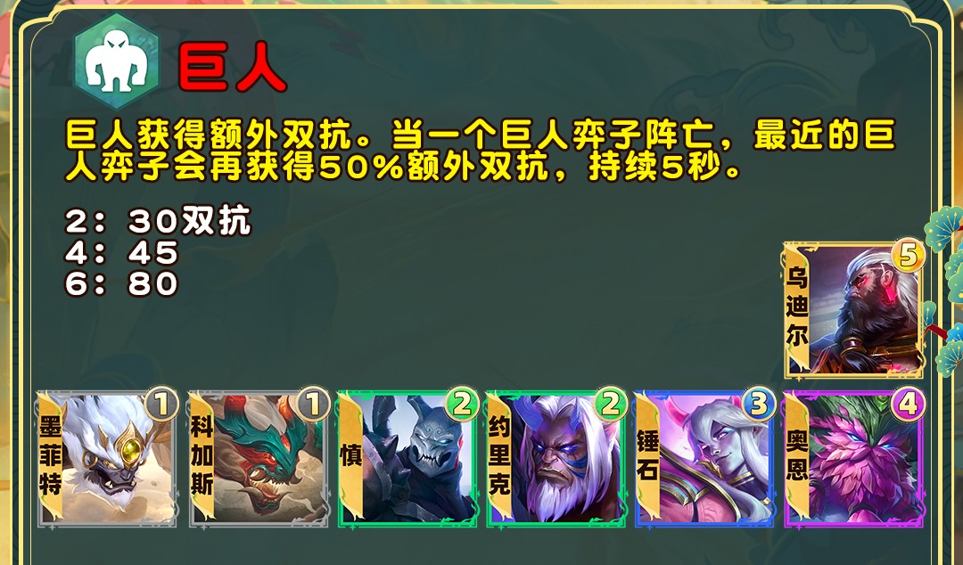 巨人获得额外双抗。当一个巨人弈子阵亡,最近的巨人弈子会再获得50%额外双抗,持续5秒。