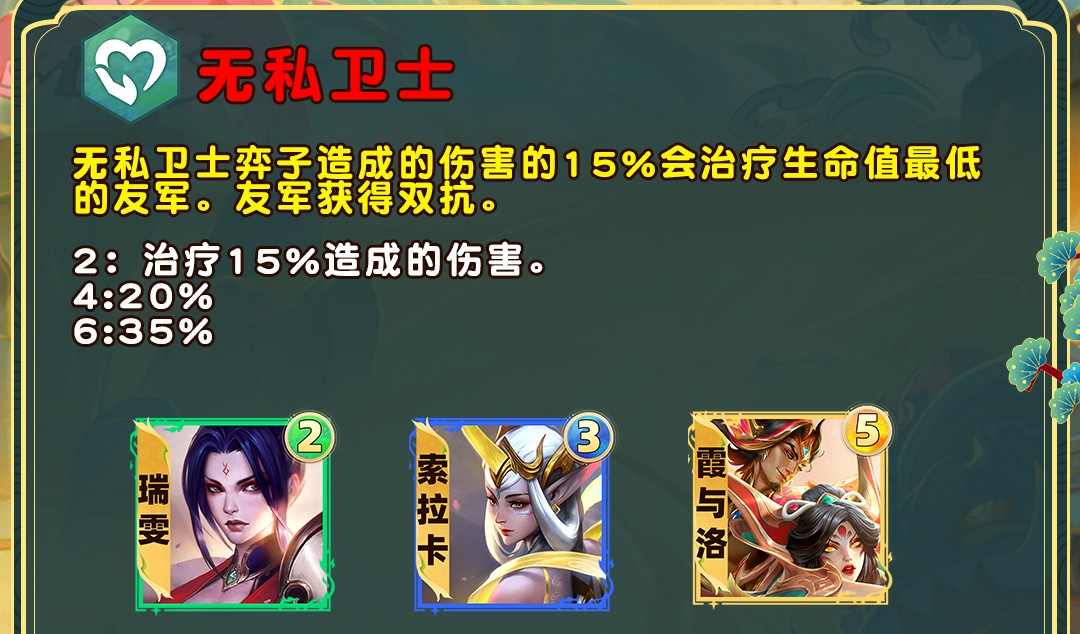 无私卫士弈子造成的伤害的15%会治疗生命值最低的友军。友军获得双抗。