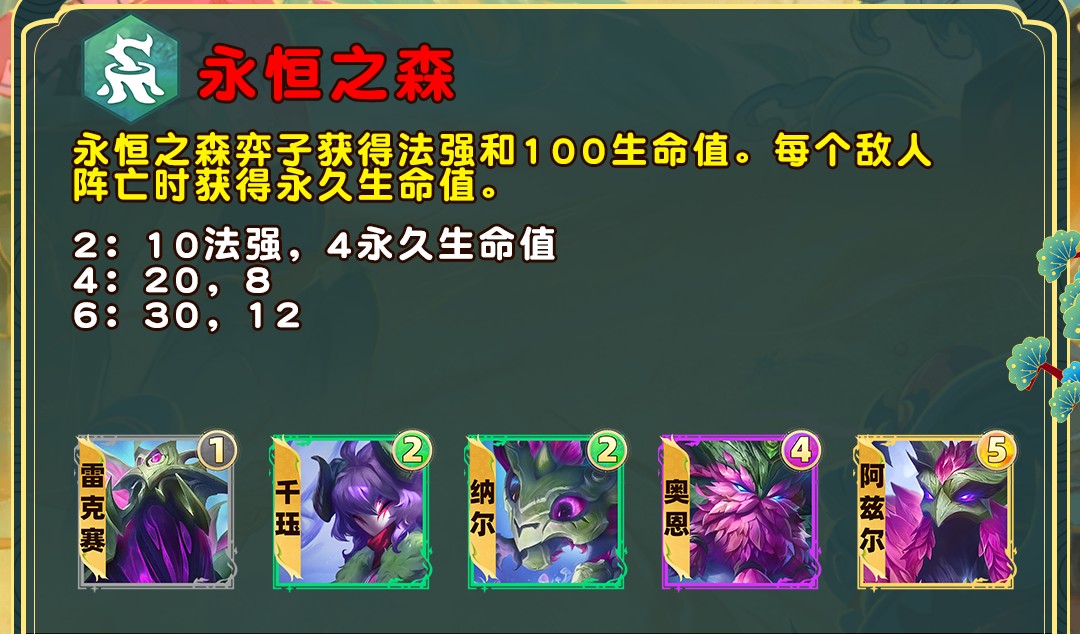 永恒之森弈子获得法强和100生命值。每个敌人阵亡时获得永久生命值。