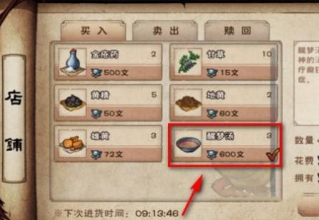 3、之后选中醒梦汤,花费600文钱就能成功购买。