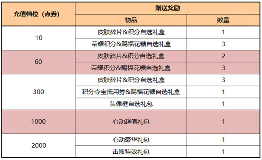 皮肤碎片+积分自选礼盒:打开礼包可任意选择以下奖励之一:荣耀积分*10或皮肤碎片*1