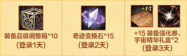 累计登录3天即可领取+15装备强化券(账号绑定)*1,宇宙精华礼盒(账号绑定)*2