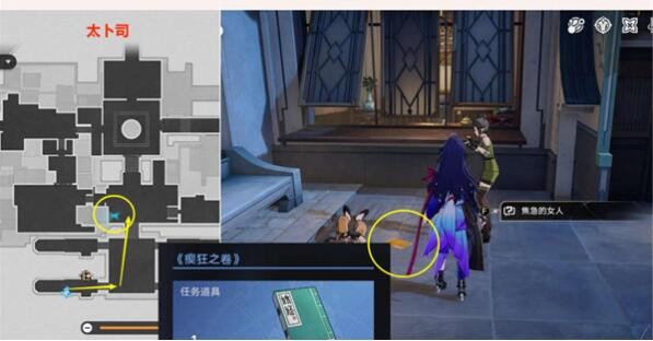 3、接着来到太卜司和npc焦急的女人对话后在地上捡到第二本书狂之卷。