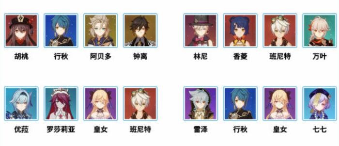 1、推荐使用香菱、安柏、风主、诺艾尔这套或者下图四套高爆发阵容。
