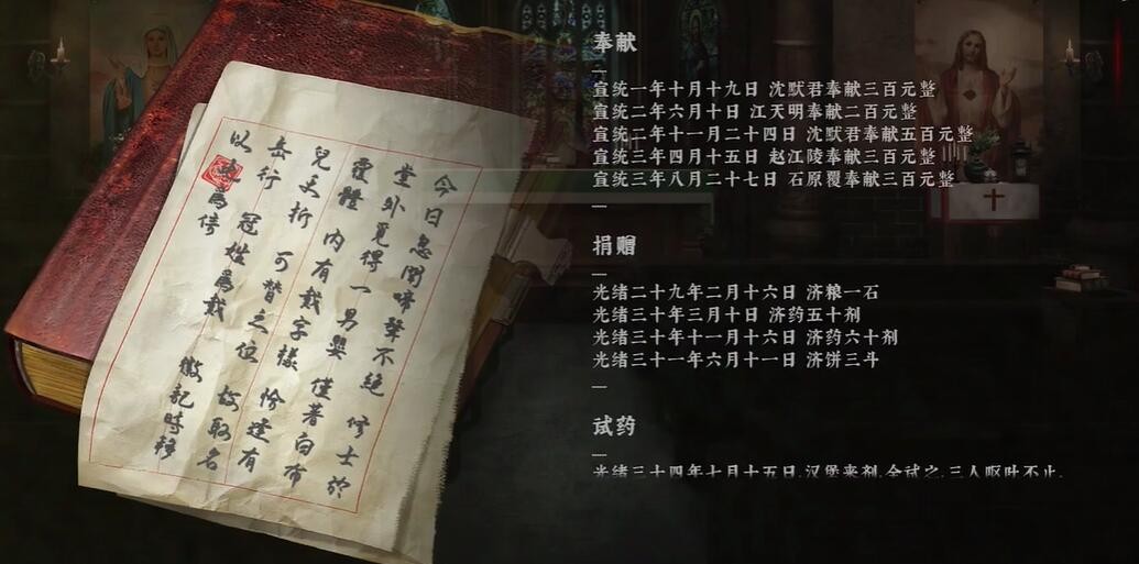23.躲避修女的视线,最后侧桌子上拿到“收容记录”“奉献收条”“传教活动记录”“手记”。