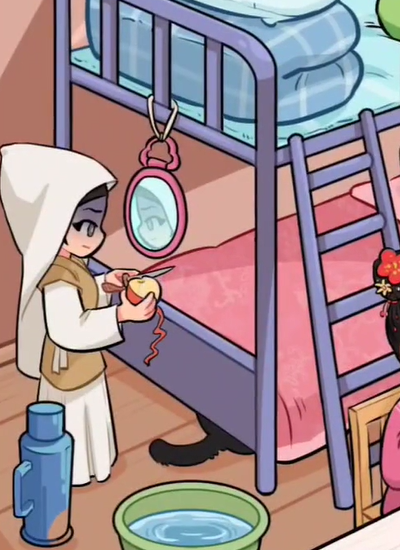 2、然后可以发现笔仙,玩家需要对着镜子削苹果,并且穿着白色衣服和突然出现的黑猫