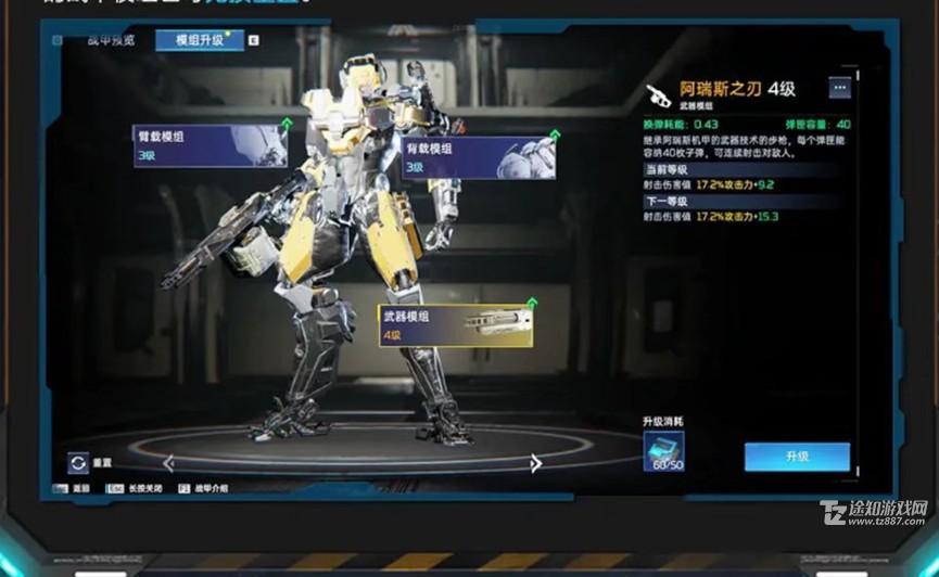 1、推荐指数三颗星,通过一些竞技挑战类玩法获取的模组强化零件能够提升战甲能力。