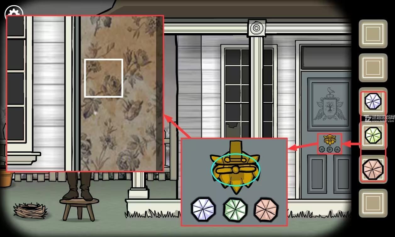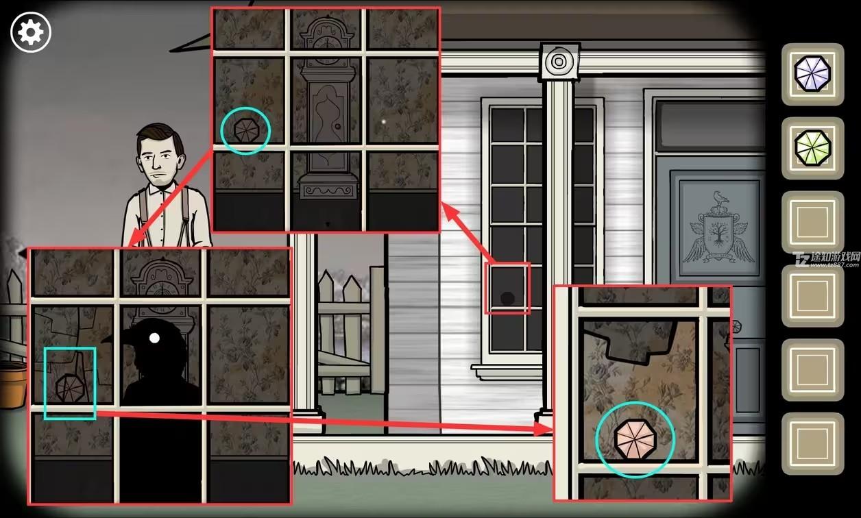 6、将界面移到最右侧,点击窗户,连续点击窗户里的钻石,房子里的乌鸦先生会突然出现帮我们按碎玻璃(请小心), 拿掉碎玻璃后获得红色(钻石)。