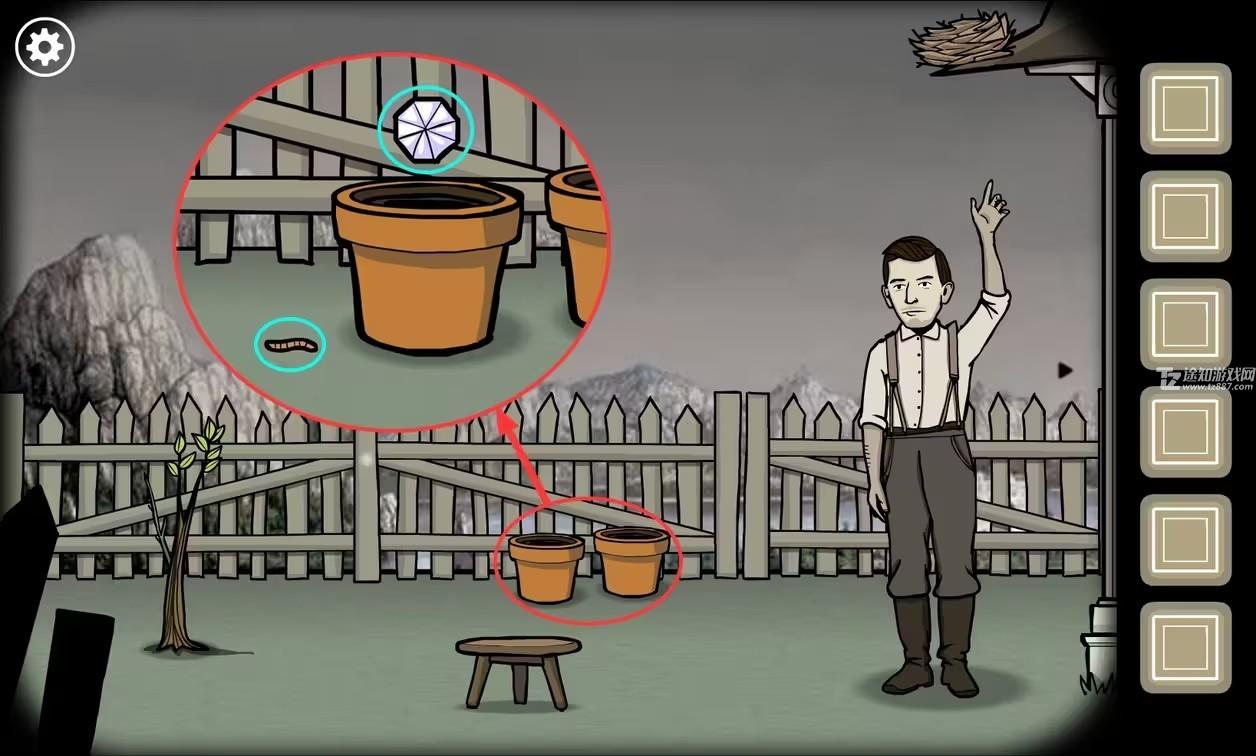 1、点击栅栏旁的花盆,在花盆旁获得(虫子),在左花盆里获得蓝色(钻石)。