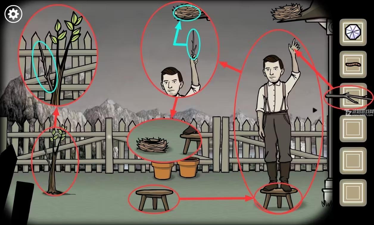 2、点击刚种的树,将最左侧的(树枝)折下;将凳子移到詹姆斯脚下让他踩上去。