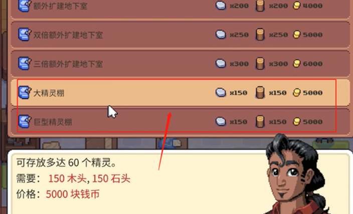 2、玩家还可以对精灵棚进行升级扩张,每次需要消耗一些石头、木头的材料和钱。随着升级可以容纳的精灵数量也会增加。