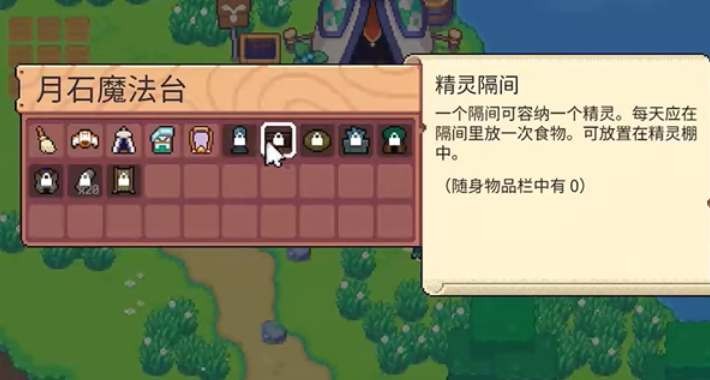 1、魔法台可以制作精灵棚和精灵隔间、精灵巢等建筑,需要的材料是月石。制作精灵棚需要10个月石。