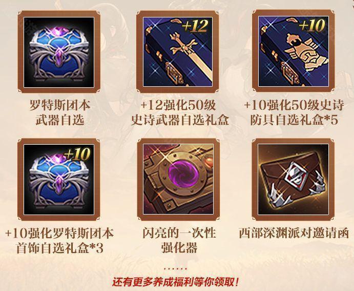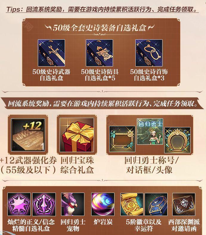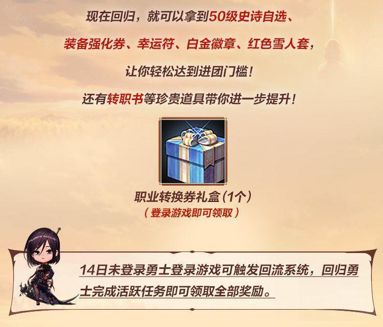 玩家现在回归,即可领取50级全套史诗装备自选礼盒、+12武器强化券(55级及以下)、职业转换券礼盒等成长奖励。创建新角色可领取+12强化史诗武器、+10强化全身史诗。