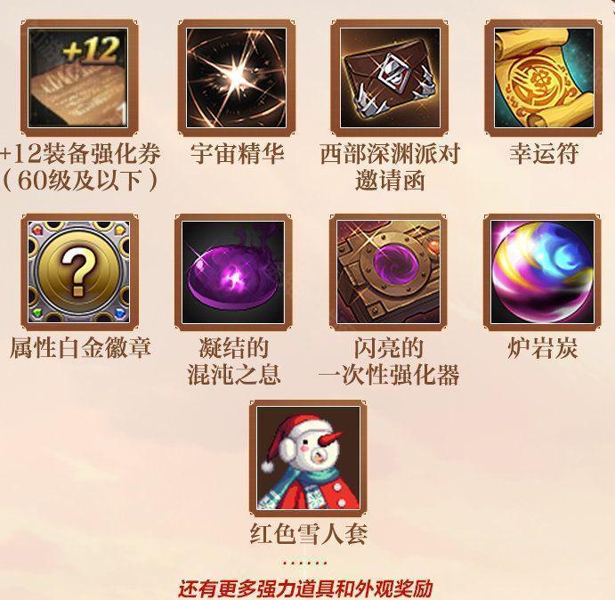 新版本活跃还可领取+12强化券(60级及以下)、红色雪人套、幸运符、宇宙精华等重磅福利!