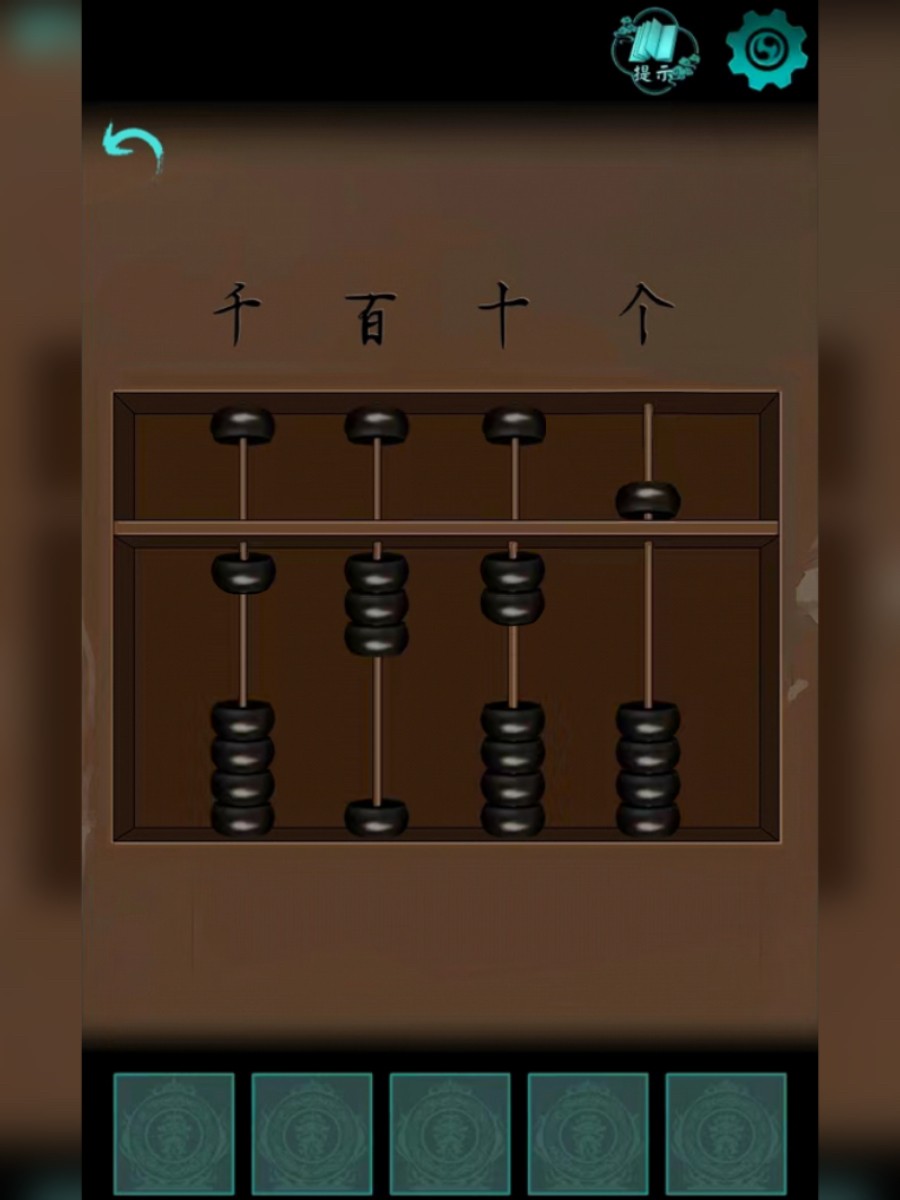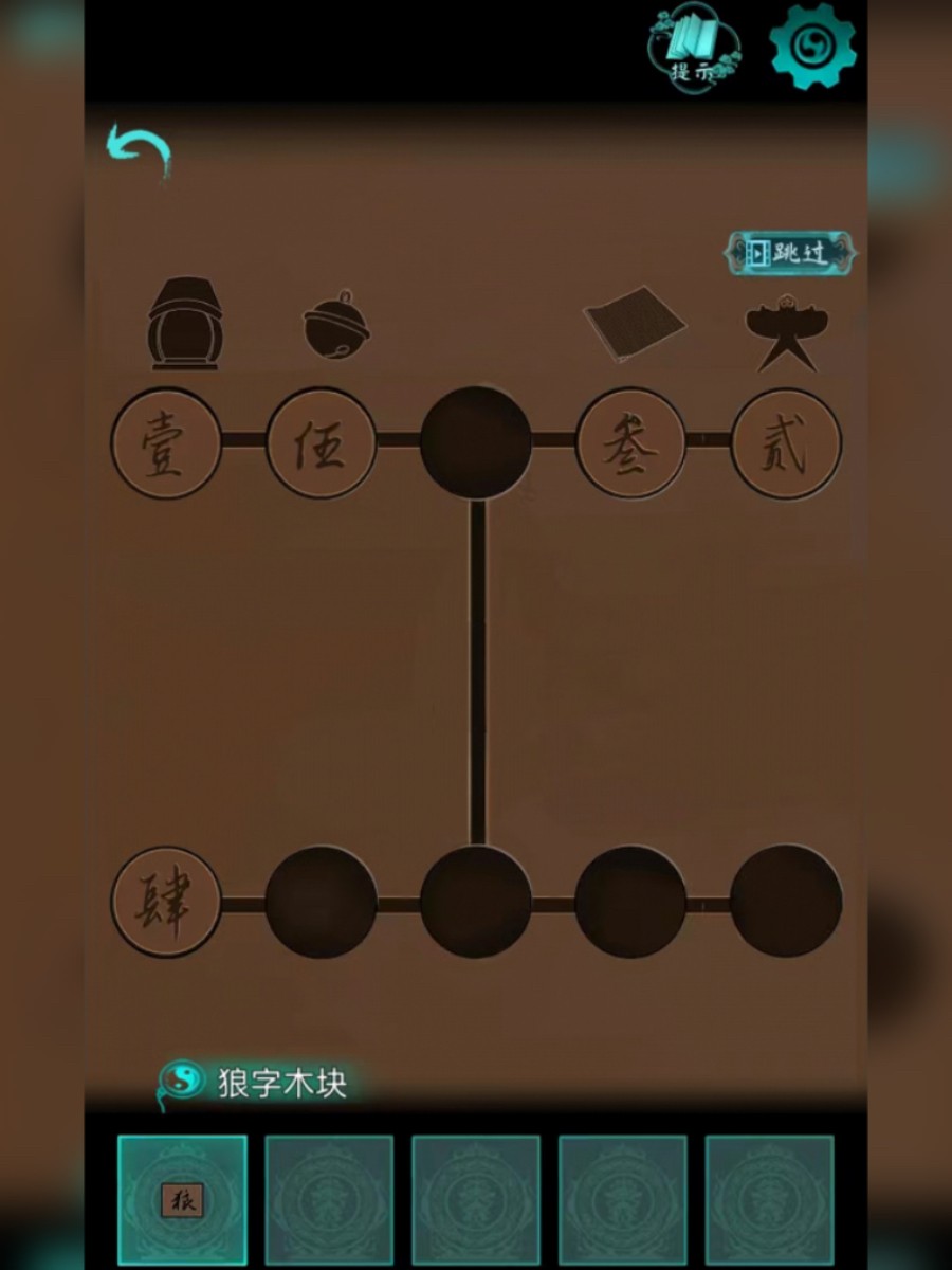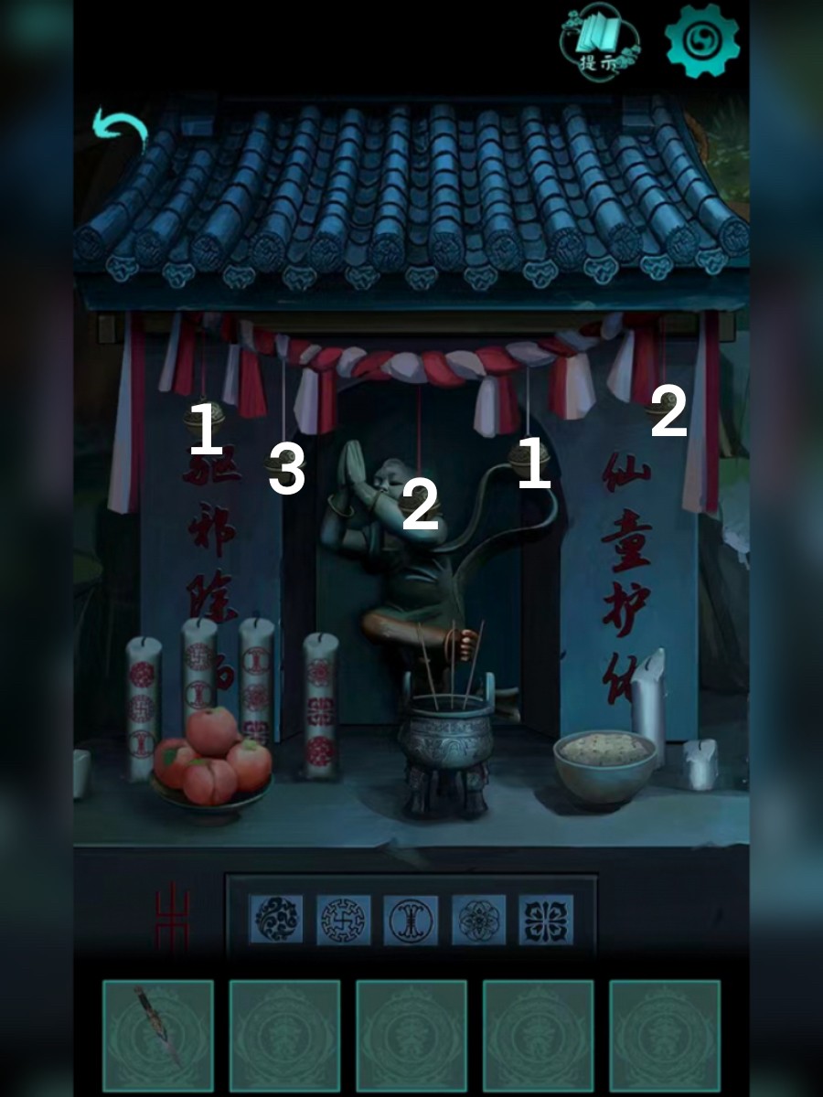 6、点击柱子走到后崖,根据提示按次数点击小庙上的铃铛,有根绳子掉下来,用绳子爬上去,然后用匕首割开树枝,从左边地上拾取狼字木块并查看书本,拨开右边凉席,获得肆字圆块,把圆块放到箱子上,根据箱子上的的图案查看对应物品的数量,打开箱子,获得红玉棒并查看木牌。