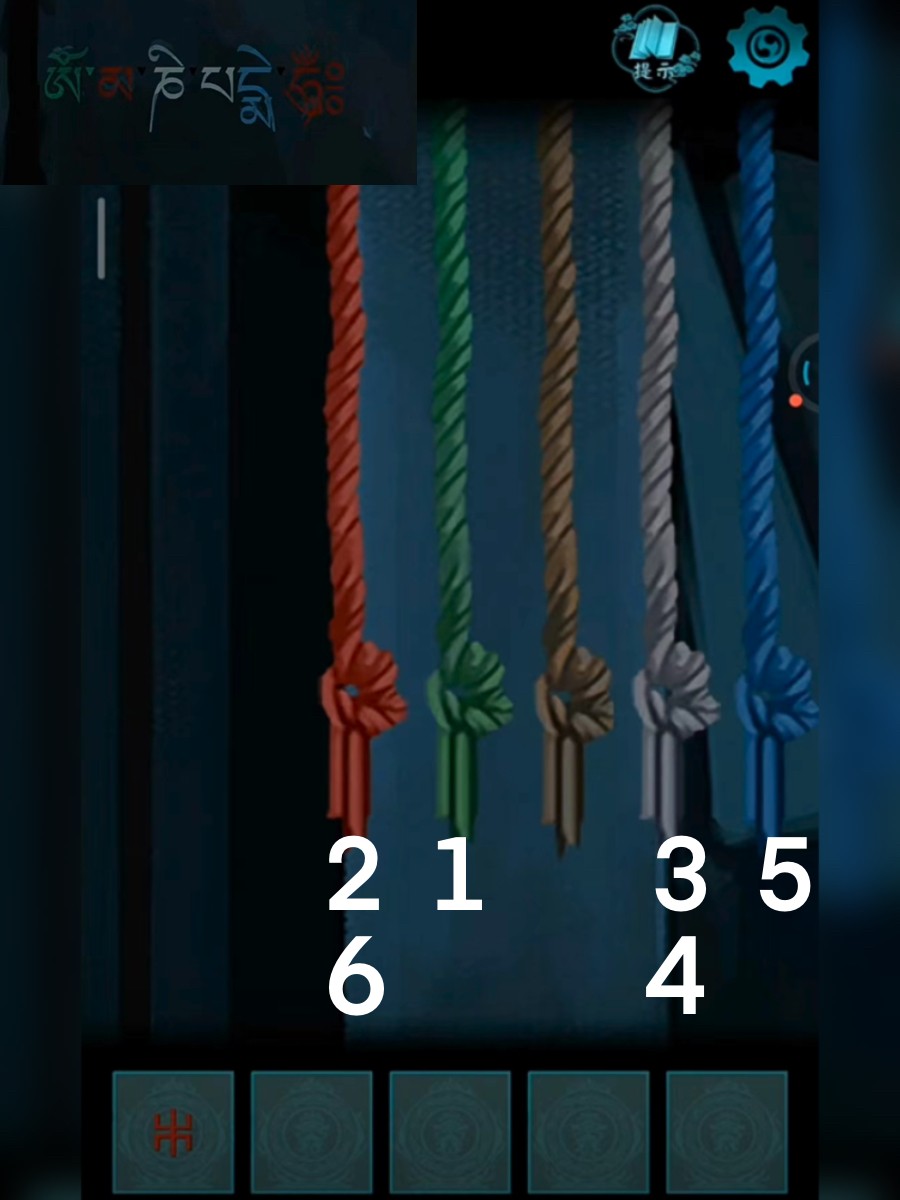 2、进入石碑后方的石洞前,用石块赶走秃鹫,从后面的石块上获得提示:绿红白白蓝红,根据提示拉动石洞门口的绳子,拾取掉下的经幡。