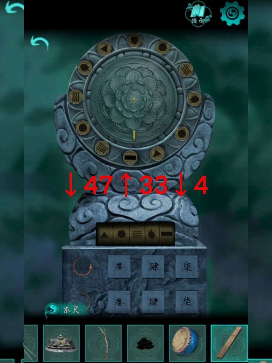 5、往右上方向的通道走,使用铁棍拾取牛粪。接着,拾取地上的干树枝。在通道的尽头遇到一个井,根据提示使用铁棍对井上的食人花进行操作,完成小游戏。这样可以打开井盖并将水倒进井里。接着从井里获得提示,并使用竹篮捞起木尺和水行鼓。根据木尺上的提示,调整后面的石碑(下47上33下4),这样可以获得大莲花宝石。