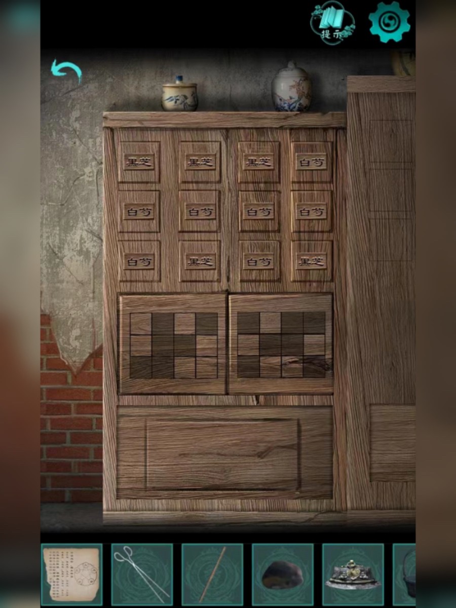1、前往药铺,进入店内寻找一个木桶。在店内墙上找到一张兽皮。请注意柜台下方的图案提示,其中黑色加白色得到黑色,黑色加黑色得到白色,白色加白色得到白色。结合柜台上的书本来调整药柜,获得针包和针灸牛皮纸。