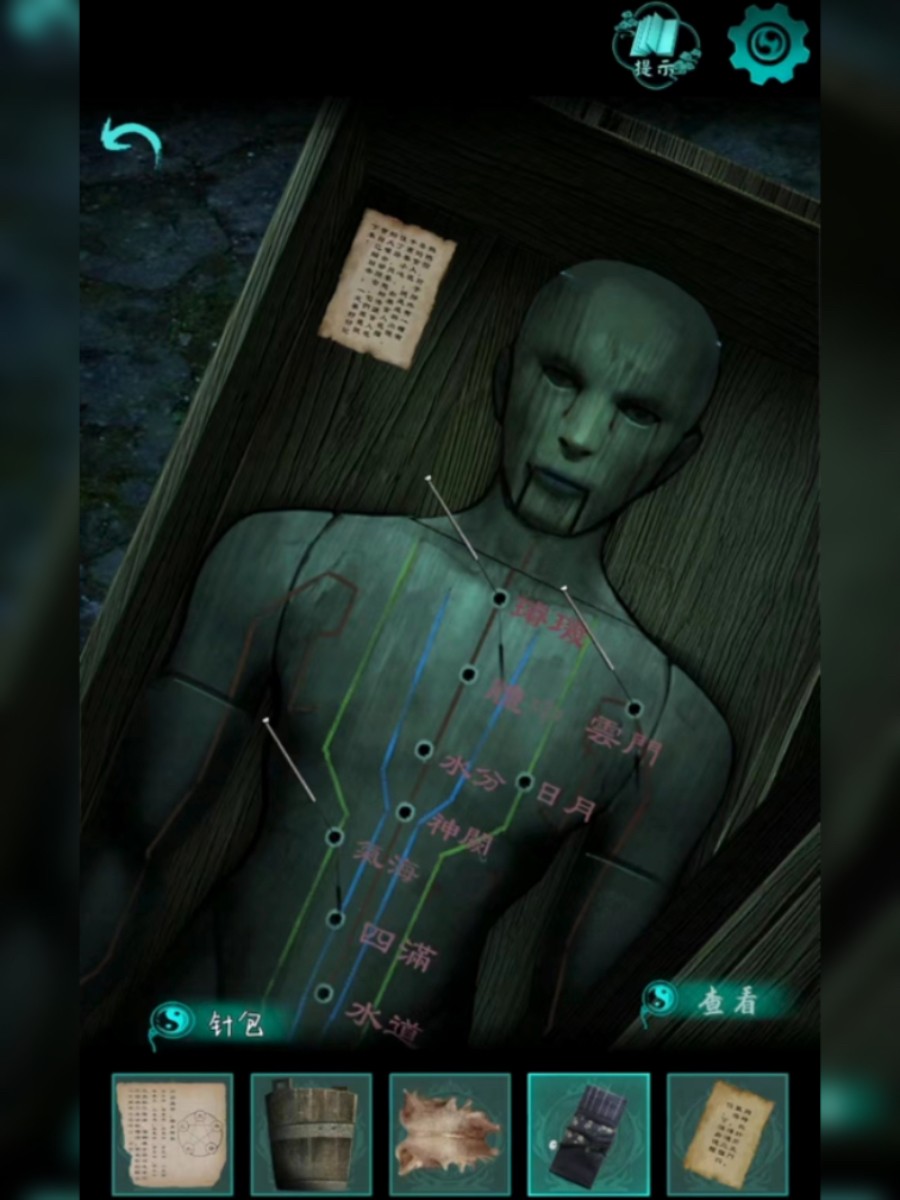 2、返回村中央,找到石桌下的木盒并将其打开。接着,根据之前获得的针灸牛皮纸上的提示,对人偶使用针包。这样做可以获得一个木鼓。从木盒里的纸张上获取提示。