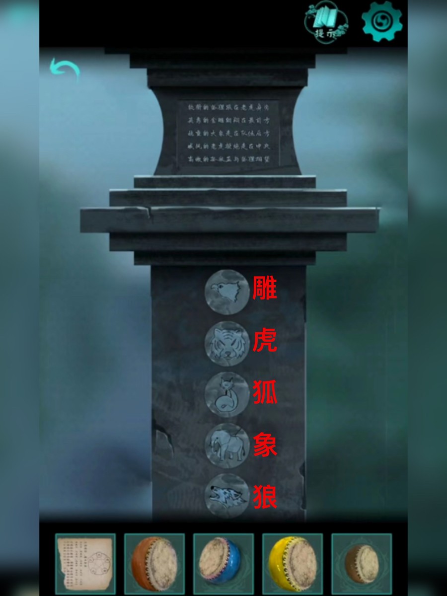 8、使用铜钥匙打开药铺门口的箱子,这样可以获得星象八卦盘。查看旁边的书本。回到村中,根据井中的星象,结合星象八卦盘打开厨房门口的石柱,这样可以获得大象圆牌。将大象圆牌放进墓园右侧的石柱上,并根据上方的文字提示调整圆牌,这样可以获得火行鼓。