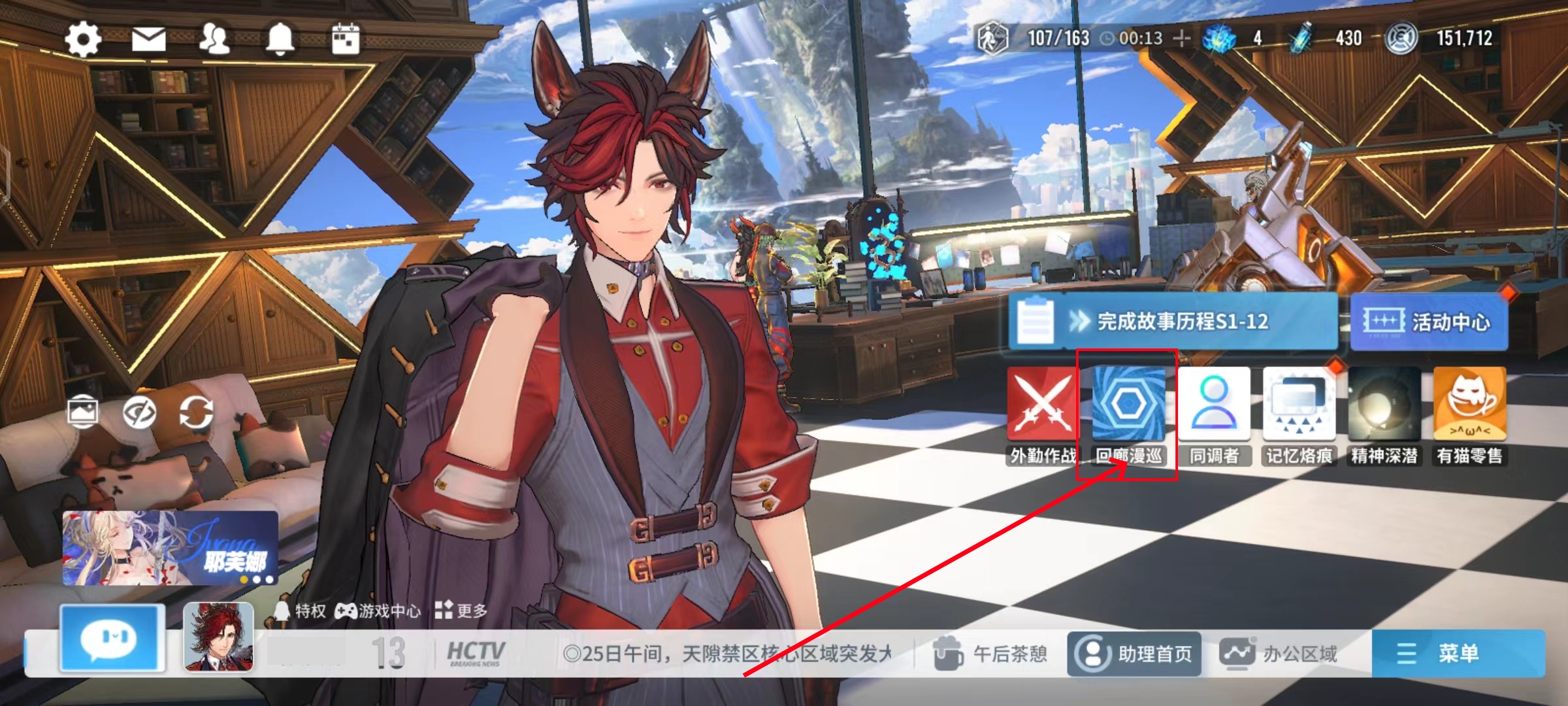 1、首先玩家进入游戏主页面找到右侧的回廊漫巡功能,点击进入。