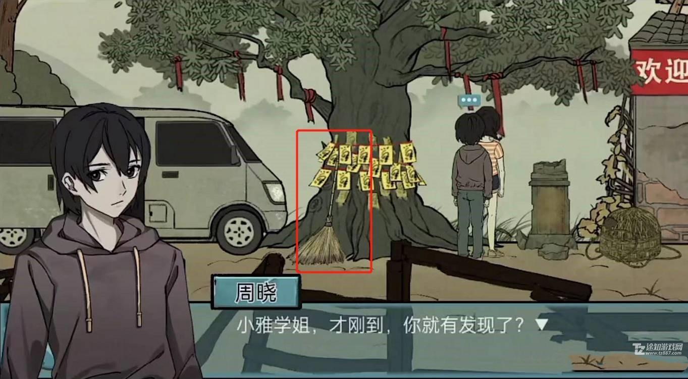 1.下车后来到村口,和小雅交谈,在大树旁边拾取【扫帚】