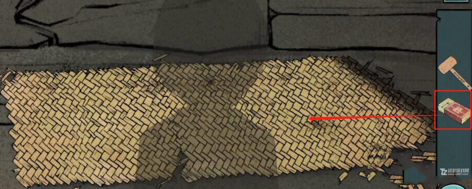 32.进入山洞来到右边,使用火柴点燃地上的草席得到【草木灰】