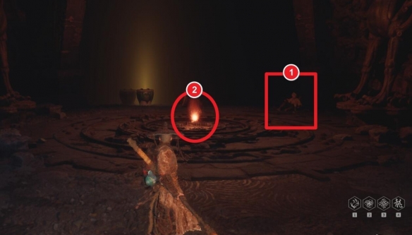 4、到达下图所示黑色宫殿后,进入大门可见篝火旁的葫芦道士。