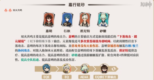 1、该组合玩法的第四人可以选择班尼特、夜兰、砂糖等提高嘉明的输出。