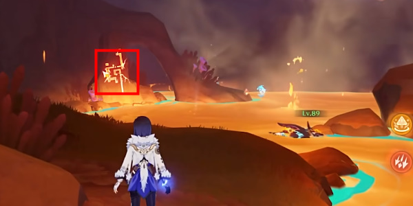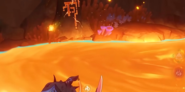 4、然后穿过铁门调查熔浆池中的装置,变身为鳍游龙寻找2处揭露文,返回熔浆池中的装置旁