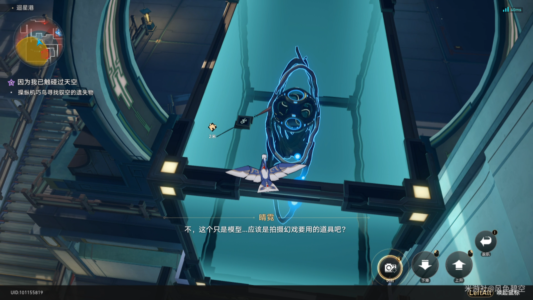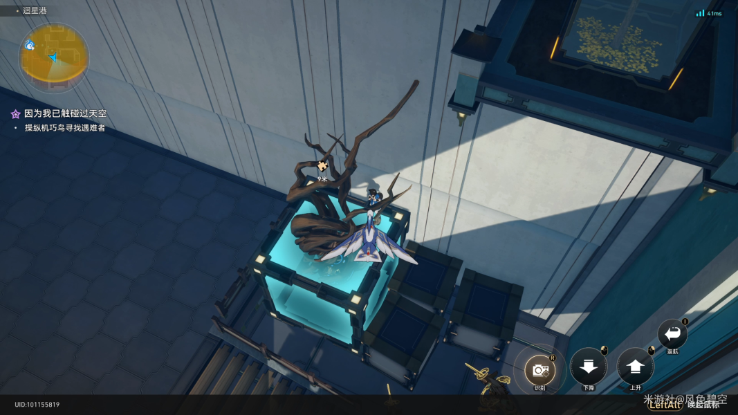 根据任务指引和老杨汇合,触发机巧鸟进行搜索。搜索时注意用机巧鸟一直飞可以触发成就“悠着点,伊卡洛斯”,然后按照顺序识别星槎怪物NPC晴霓。