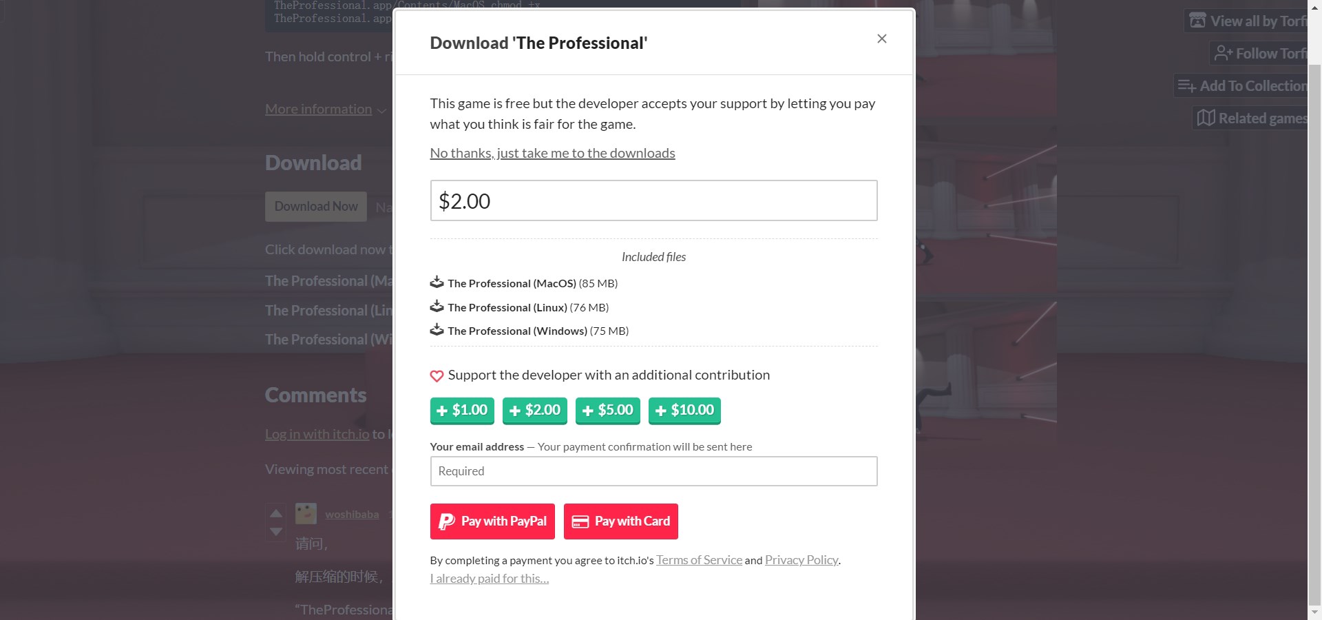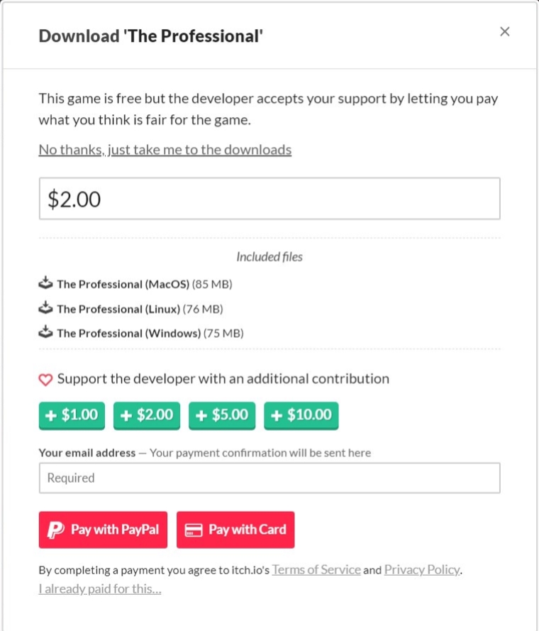 江洋大盗模拟器在哪里玩 江洋大盗模拟器游玩地址分享 时间:2025/08/13 20:52:13小编:来源: 江洋大盗模拟器在哪里玩?江洋大盗模拟器是一款非常火爆的移植手游,游戏非常有意思,很多小伙伴可能不太清楚具体在哪里可以购买游玩。那么接下来小编就为各位小伙伴带来江洋大盗模拟器游玩地址分享。 江洋大盗模拟器游玩地址分享 游玩地址:https://torfi.itch.io/the-professional 详细介绍 1、首先复制游玩地址粘贴到浏览器跳转,即可进入页面。 2、下滑页面找到并点击【Download Now】。 3、选择支付方式之后购买,即可开始游玩。 4、也可以点击此处下载,更加方便。 以上就是有关于江洋大盗模拟器游玩地址分享的内容,更多内容请继续关注宅玩攻略组。 相关文章 攻略心得 波西亚时光隐藏宝箱位置全介绍 波西亚时光隐藏剧情有哪些? 炉石传说酒馆战棋新随从野猪老水手怎么样 炉石传说酒馆战棋野猪人随从 无限暖暖满电行动效果及获取方法 暖暖无限少女 原神5.0食谱有哪些 原神5.0新增食谱获取方法 王者荣耀九周年返场皮肤有哪些 王者荣耀九周年返场皮肤介绍2024 阴阳师大江山宴会邀约怎么玩 阴阳师大江山抉择怎么选 明日方舟第三季更新预告:第三季何时上线有哪些新内容 热门推荐 最热排行 评分最高 超进化物语 下载 阴阳师 下载 吉吉影音 下载 元气骑士 下载 率土之滨 下载 梦幻西游手游 下载 荒野行动 下载 元游中国象棋 下载 蛋仔派对 策略 1.95 GB 蛋仔派对手游 v1.0.220 - 安卓版 下载 神庙逃亡2 冒险 78.68MB 神庙逃亡2 v5.0.0 - 安卓版 下载 恋与制作人 角色 688.37MB 恋与制作人 v1.9.0823 - 安卓版 下载 天天斗地主 休闲 26.10MB 天天斗地主 v8.00.041 - 安卓版 下载 我的安吉拉 模拟 80.53MB 我的安吉拉 v4.2.1.306 - 安卓版 下载 无尽的拉格朗日:砺舰归来 下载 unVEIL the world 下载 燕云十六声 下载 元气骑士前传 下载 元气骑士 下载 战魂铭人 下载 阴阳师 下载 率土之滨 下载 梦幻西游手游 策略 182.11MB 梦幻西游手游 v1.532.1 - 安卓版 下载 蛋仔派对 策略 1.95 GB 蛋仔派对手游 v1.0.220 - 安卓版 下载 游戏王:决斗链接 策略 303.87MB 游戏王:决斗链接 v1.0 - 安卓版 下载 三国演义:吞噬无界 策略 479.74 MB 三国演义:吞噬无界 v4.1.14 - 安卓版 下载 超进化物语 策略 282.66 MB 超进化物语 v1.1.18 - 安卓版 下载 用户评论 deving