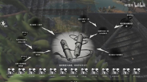 击败大盗或能取得线索+破解机关与神功无关+机关需以倒序启动=三清通玄护道,六旬仙迹显踪。(错误推论,但是不影响剧情推进)